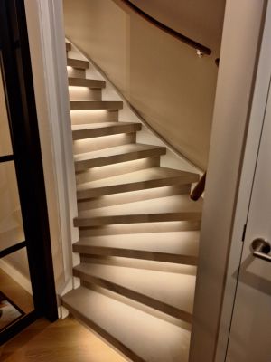 Ik kan de verlichting niet achter de trap plaatsen. Hierdoor zullen de draden onder de nieuwe overzettreden en achter de stootborden geplaatst moeten waren.