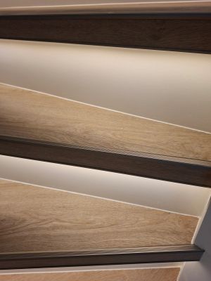 Geen profielen besteld, maar in alle 16 treden over volle lengte kamers gefreest. Kamers goed geschuurd en gegrond. De COB plakstrips houden tot nu toe prima.